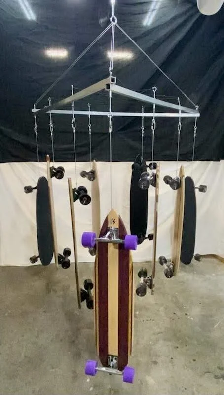 A skateboard janitor, hanging upside down from a circular rack, with multiple skateboards attached around it, in a skate shop or warehouse setting.