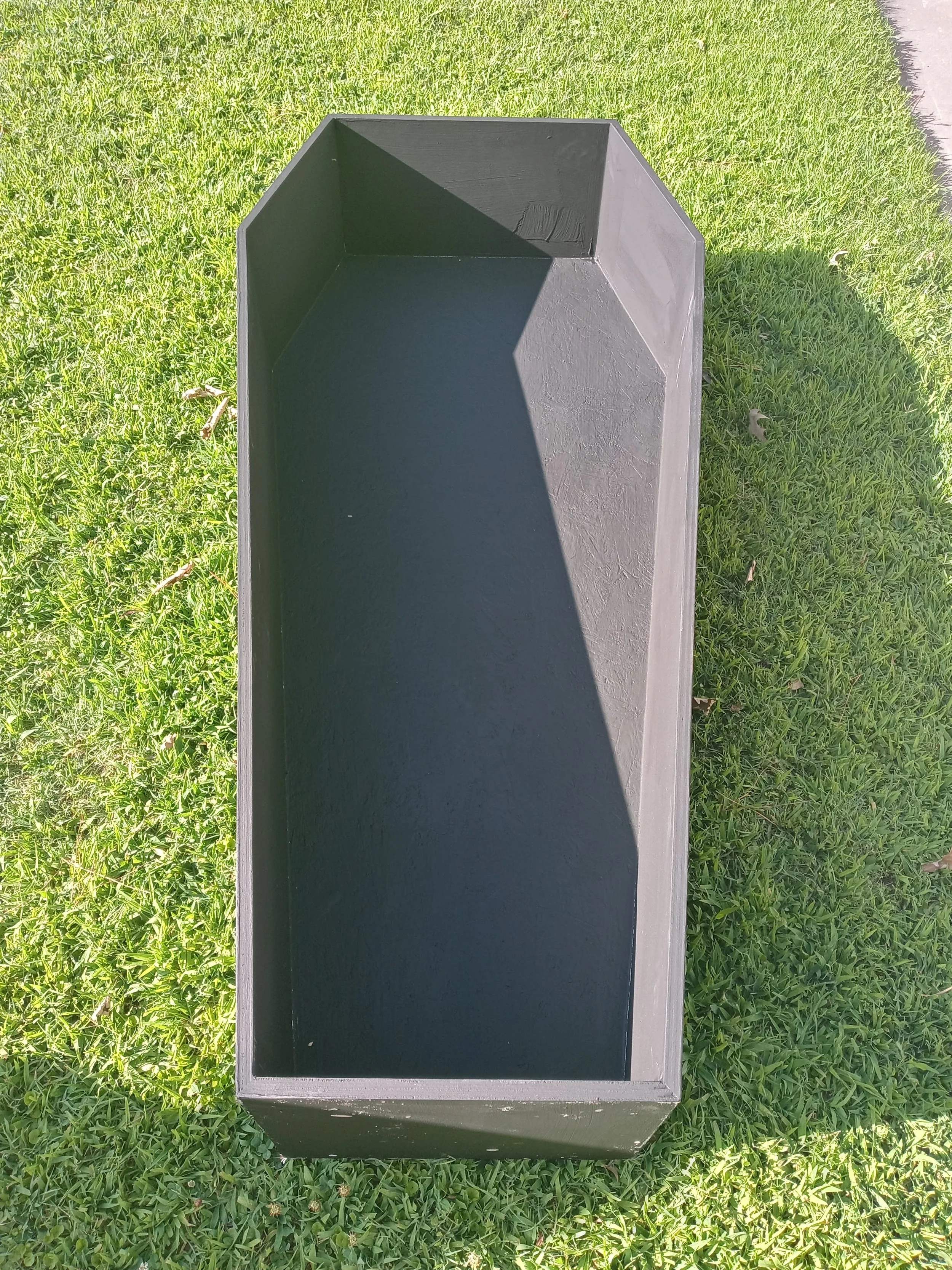 A wooden box with the word 'BLUE' engraved on the top, sitting on a gray work surface in a workshop.