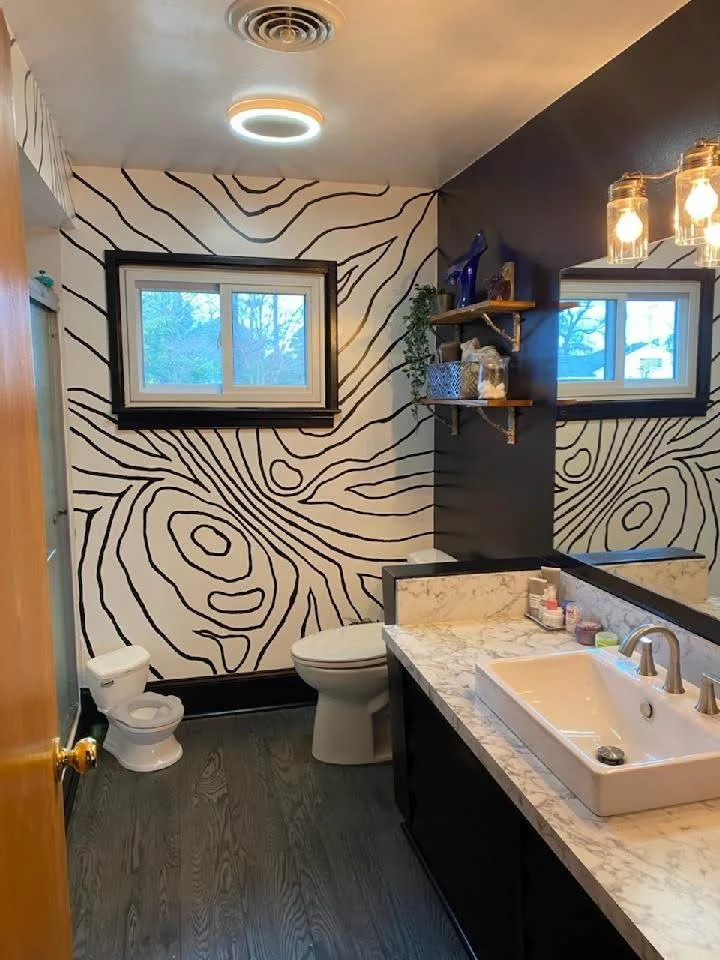 Bathroom with black zigzag wallpaper, small rectangular window, toilet, marble countertop with rectangular sink, wall-mounted shelves, and pendant lighting.
